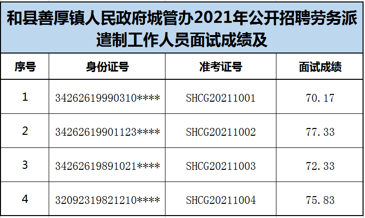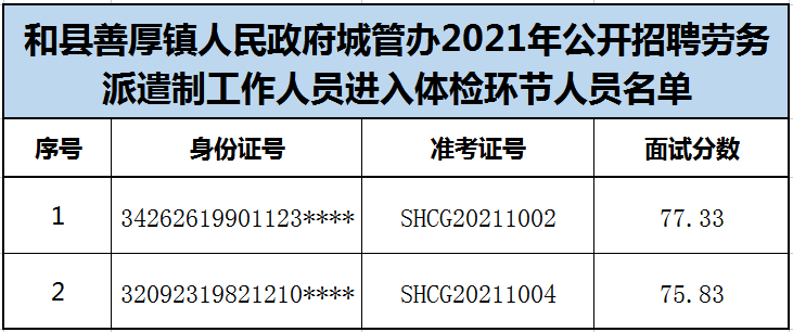 和縣善厚鎮(zhèn)人民政府城管辦2021年公開招聘勞務(wù)派遣制工作人員面試成績及進(jìn)入體檢環(huán)節(jié)名單公告